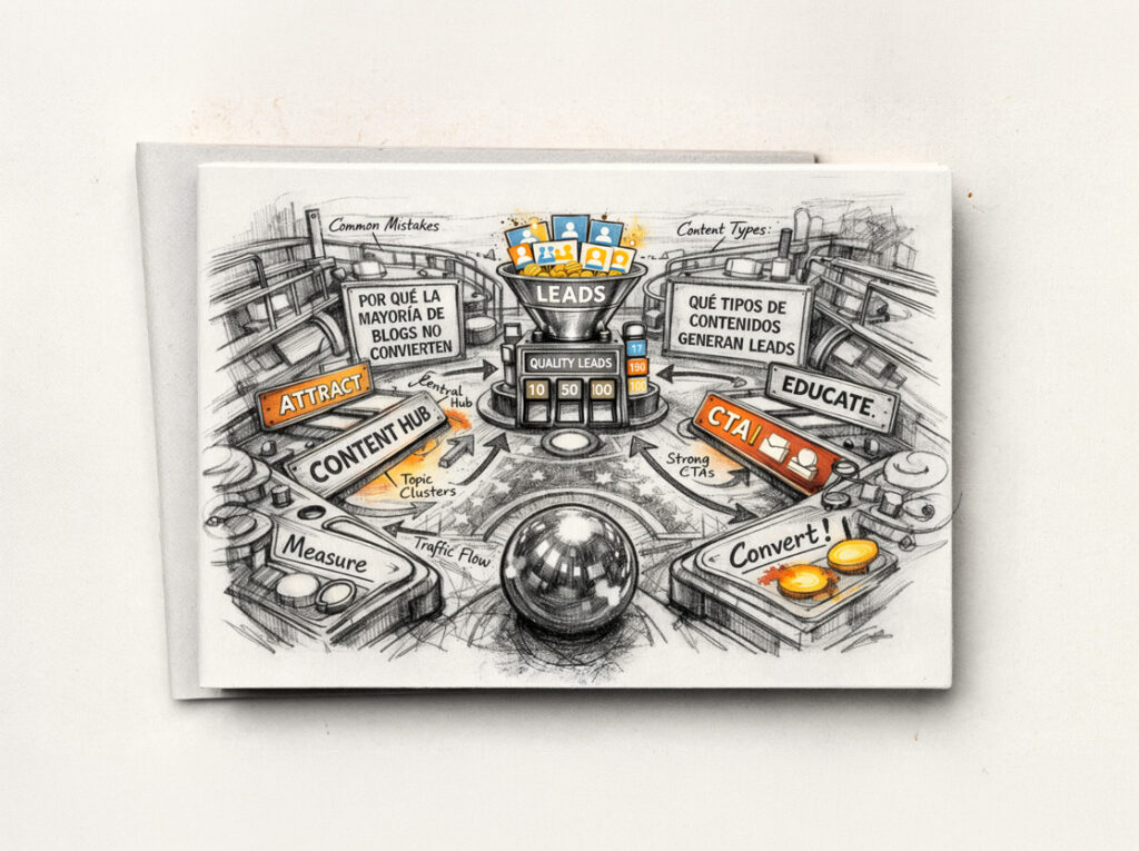 El salto de blog a “máquina de leads” ocurre cuando conviertes tu contenido en un recorrido. Ese recorrido empieza con una pregunta (búsqueda), continúa con una respuesta útil (contenido), y termina con una decisión guiada (CTA + propuesta de valor). La clave es que el blog deje de ser un archivo y pase a ser un sistema: un mapa de conocimiento conectado, con puntos de conversión coherentes y medición desde el primer día.